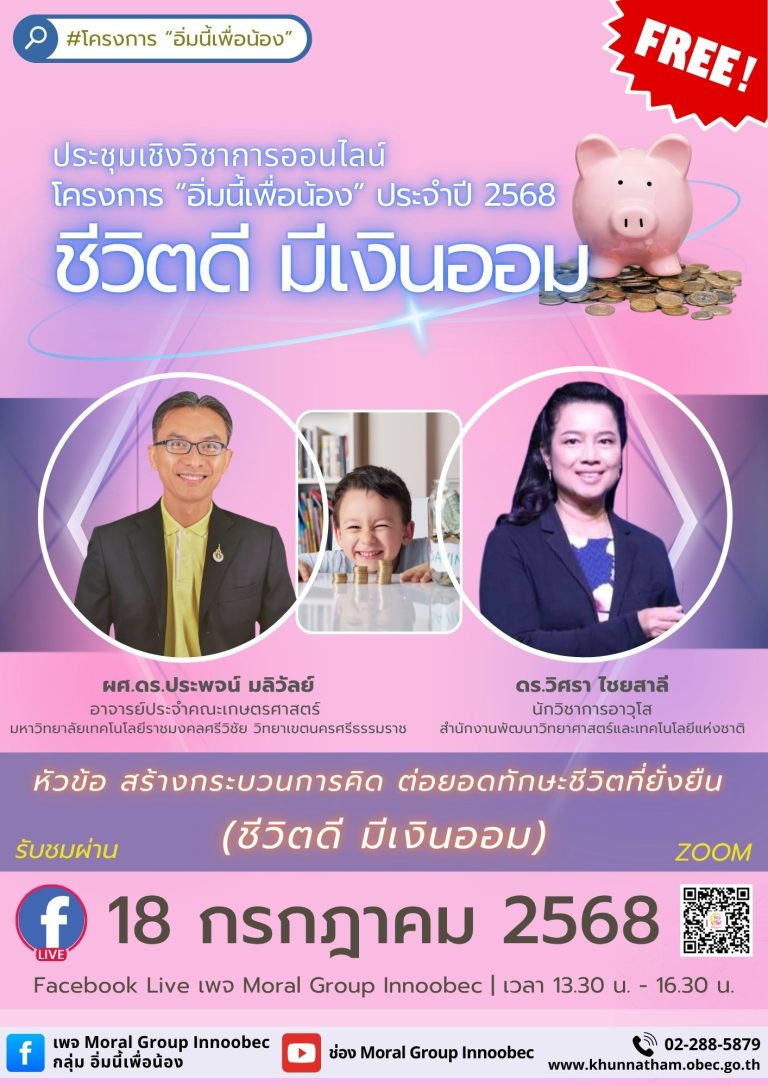 การประชุมวิชาการ โครงการ “อิ่มนี้เพื่อน้อง” ประจำปี 2568 ภายใต้หัวข้อ สร้างกระบวนการคิด ต่อยอดทักษะชีวิตที่ยั่งยืน (ชีวิตดี มีเงินออม) เจอกัน 18 กรกฎาคม 2568 เวลา 13.30- 16.30 น.